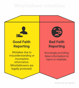 In contrast, bad-faith or malicious reporting involves knowingly providing false information with the intention to harm a colleague, retaliate, or damage the organisation. This distinction is crucial because the outcome for the whistleblower depends heavily on their intention, not the accuracy of their report.